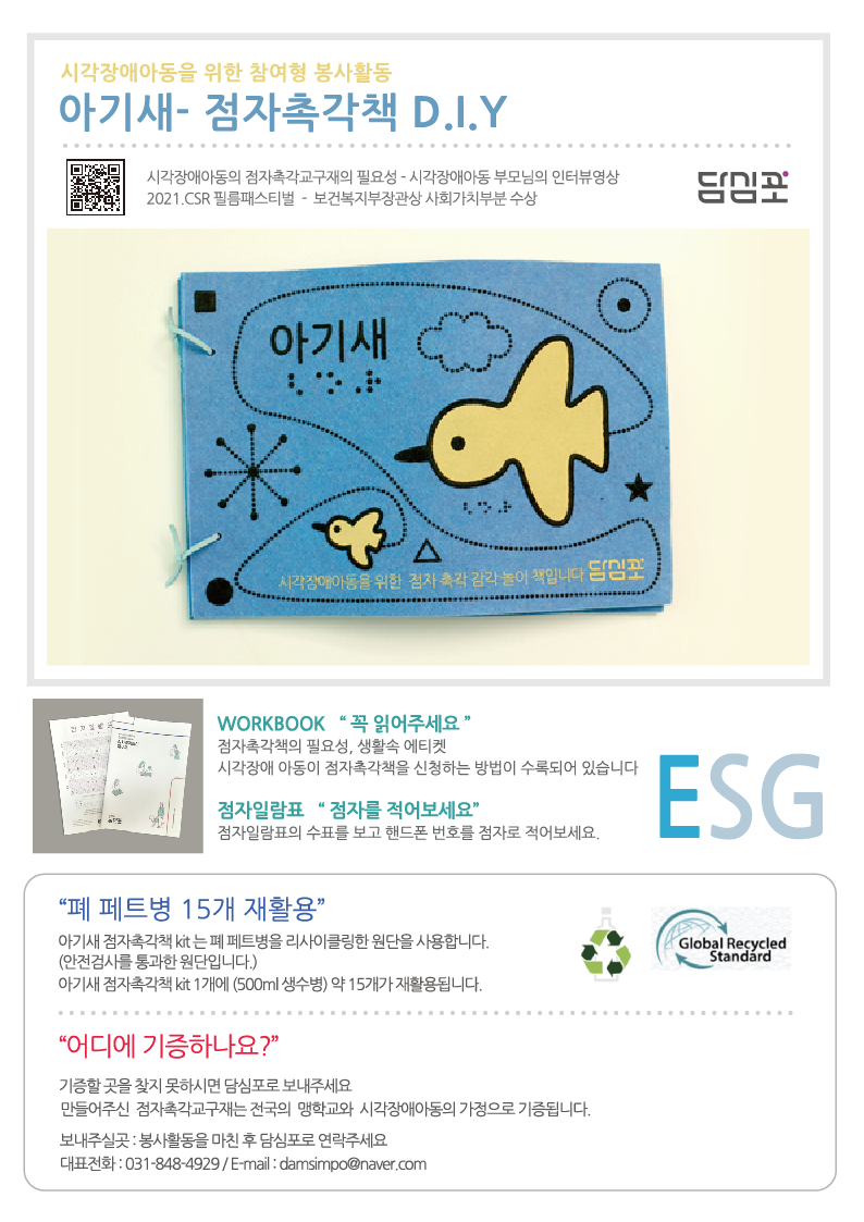 *점자촉각책을 만들어 (주)담심포로 보내주시면 점자도서관과 맹학교의 시각장애아동들에게 보내드리겠습니다.